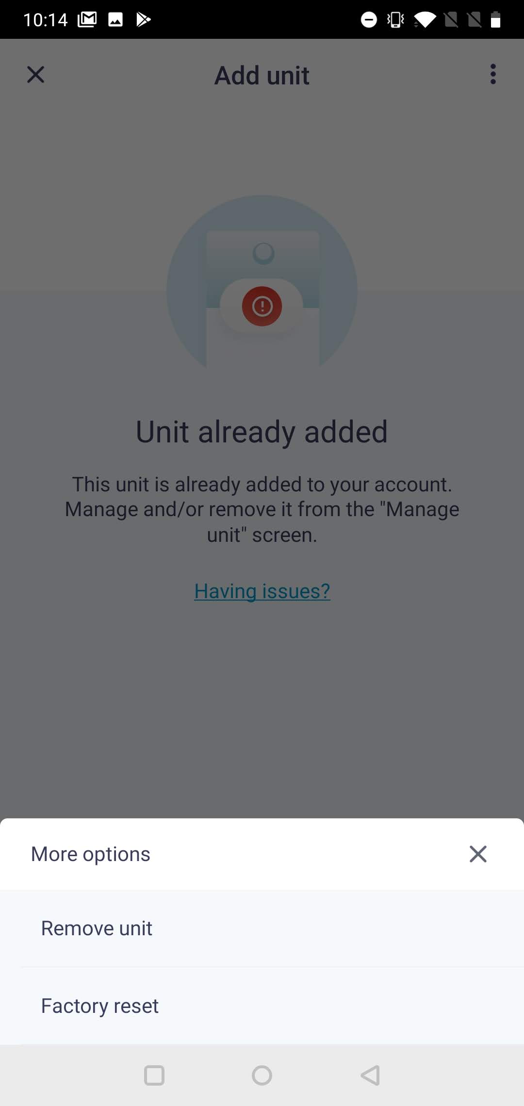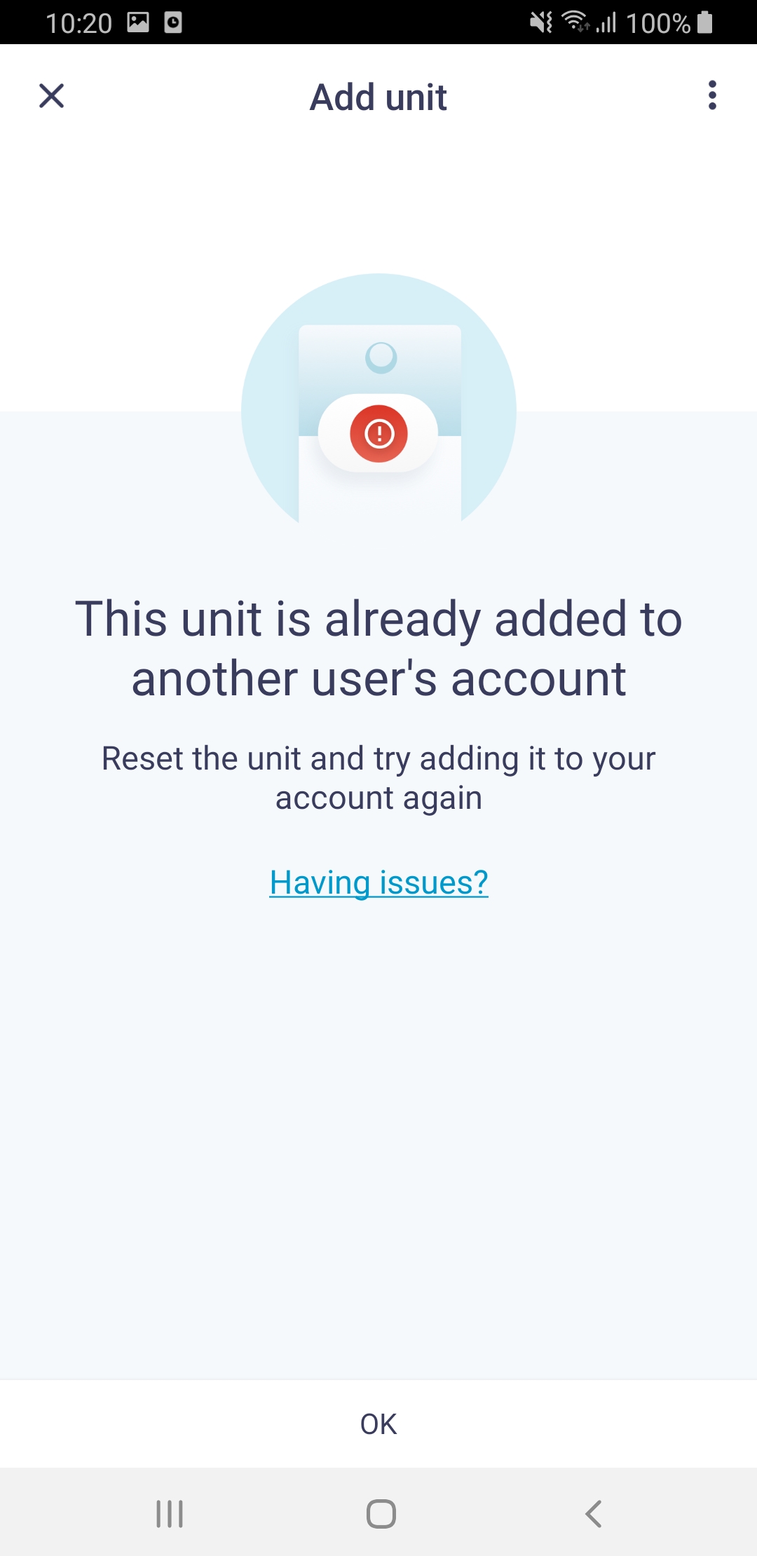 Lorsque vous réessayez d'ajouter une unité à votre compte utilisateur, il est possible que l'application vous informe que cette unité « a déjà été ajoutée à un autre compte utilisateur». Ne vous inquiétez pas, ceci n'a pas été réalisé dans le Cloud. Il vous est toutefois nécessaire de dissocier l'unité avant de tenter à nouveau de l'ajouter à votre compte.